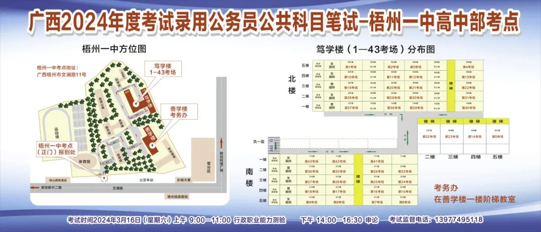 一、廣西2024年度考試錄用公務(wù)員(選調(diào)生)公共科目筆試將于3月16日舉行,梧州考區(qū)共設(shè)置9個考點,請考生提前熟悉各自考點位置、周邊環(huán)境及交通情況,考試當(dāng)天提前出門做好準(zhǔn)備,準(zhǔn)時參加考試。特別提示:因考點停車場地有限,所有考生車輛不得進(jìn)入考點,請考生規(guī)劃好前往考點的交通方式和路線。