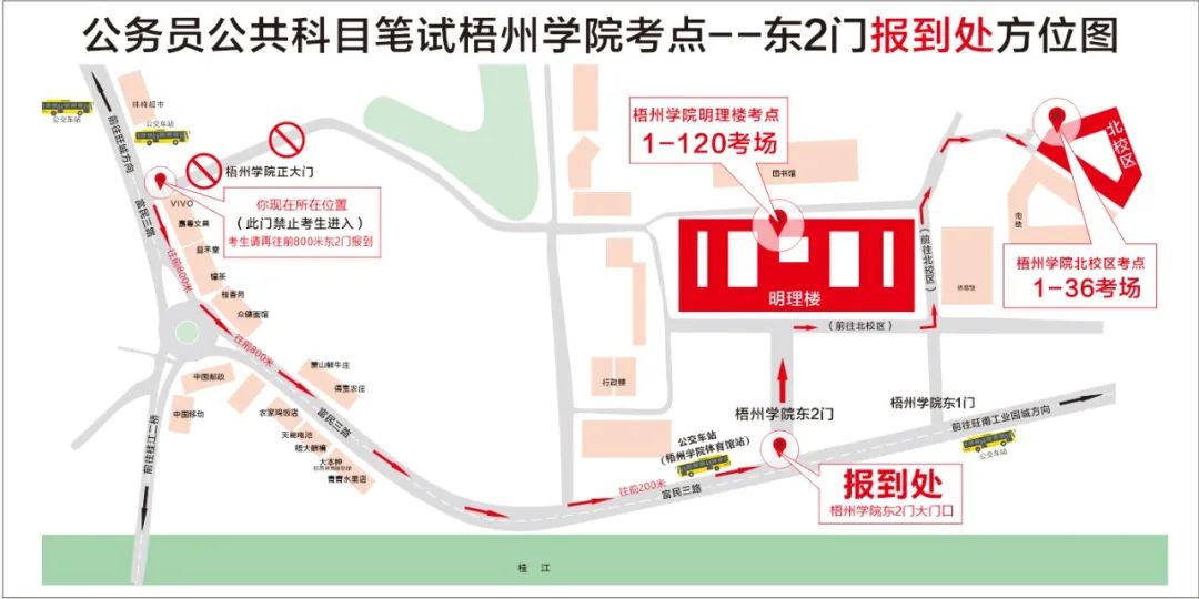公交車參考:乘坐10路、32路、49路、49路延長線、蒼梧城鄉(xiāng)6路到梧州學(xué)院體育館站,下車后步行約200米到達(dá)梧州學(xué)院東大門??忌y(tǒng)一在梧州學(xué)院東大門進(jìn)入,考點門口處于交通干道,送考車輛只能在東門外短暫停留,梧州學(xué)院南門及其他門無法核驗考生身份。從東大門進(jìn)入明理教學(xué)樓考點考場步行約5分鐘,進(jìn)入北校區(qū)教學(xué)樓考點考場步行約15分鐘,請規(guī)劃好進(jìn)入考點時間。