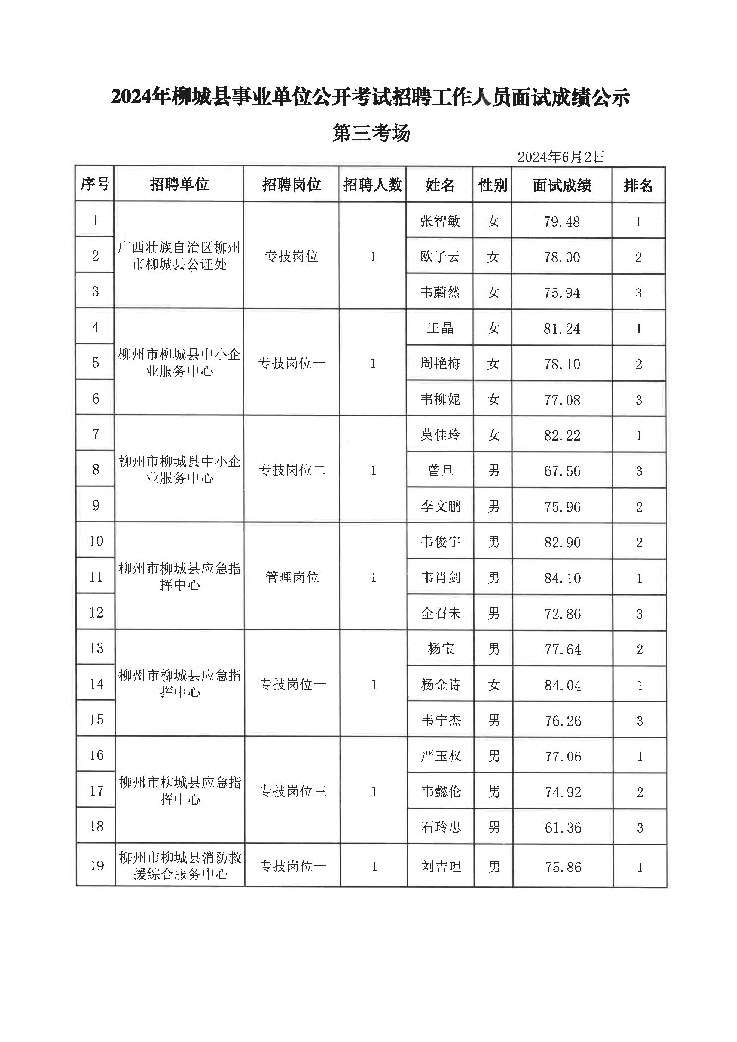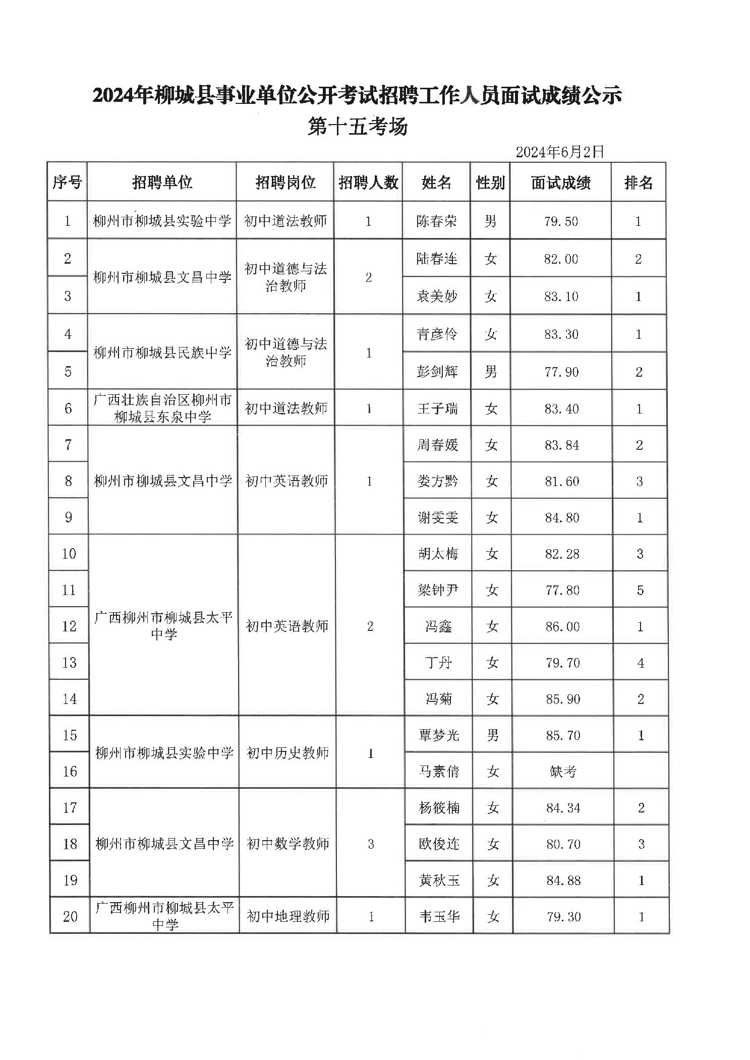2024年柳城縣事業(yè)單位公開(kāi)考試招聘工作人員面試成績(jī)公示