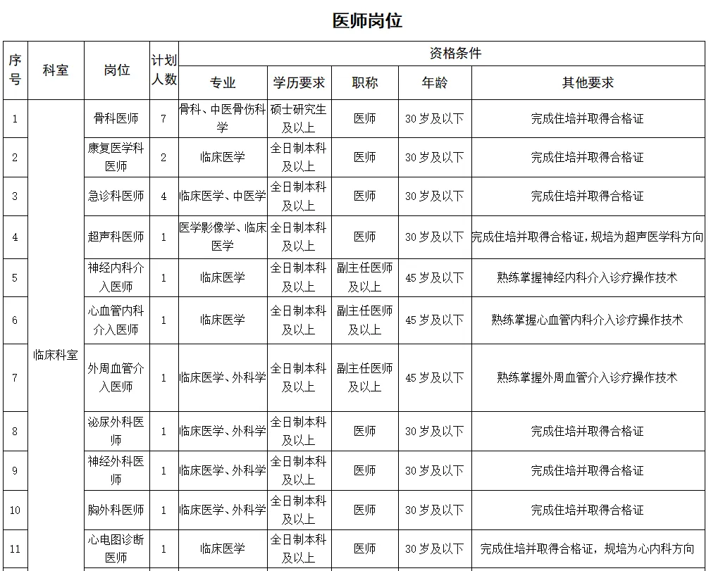 2.條件要求:具備碩士研究生及以上學(xué)歷(部分緊缺專業(yè)可放寬至本科學(xué)歷),年齡不超35歲;專業(yè)理論功底扎實(shí),業(yè)務(wù)技術(shù)過(guò)硬,有良好的團(tuán)隊(duì)合作精神;有二級(jí)甲等及以上醫(yī)院工作5年及以上經(jīng)歷,并有三級(jí)甲等醫(yī)院進(jìn)修6個(gè)月及以上經(jīng)歷。