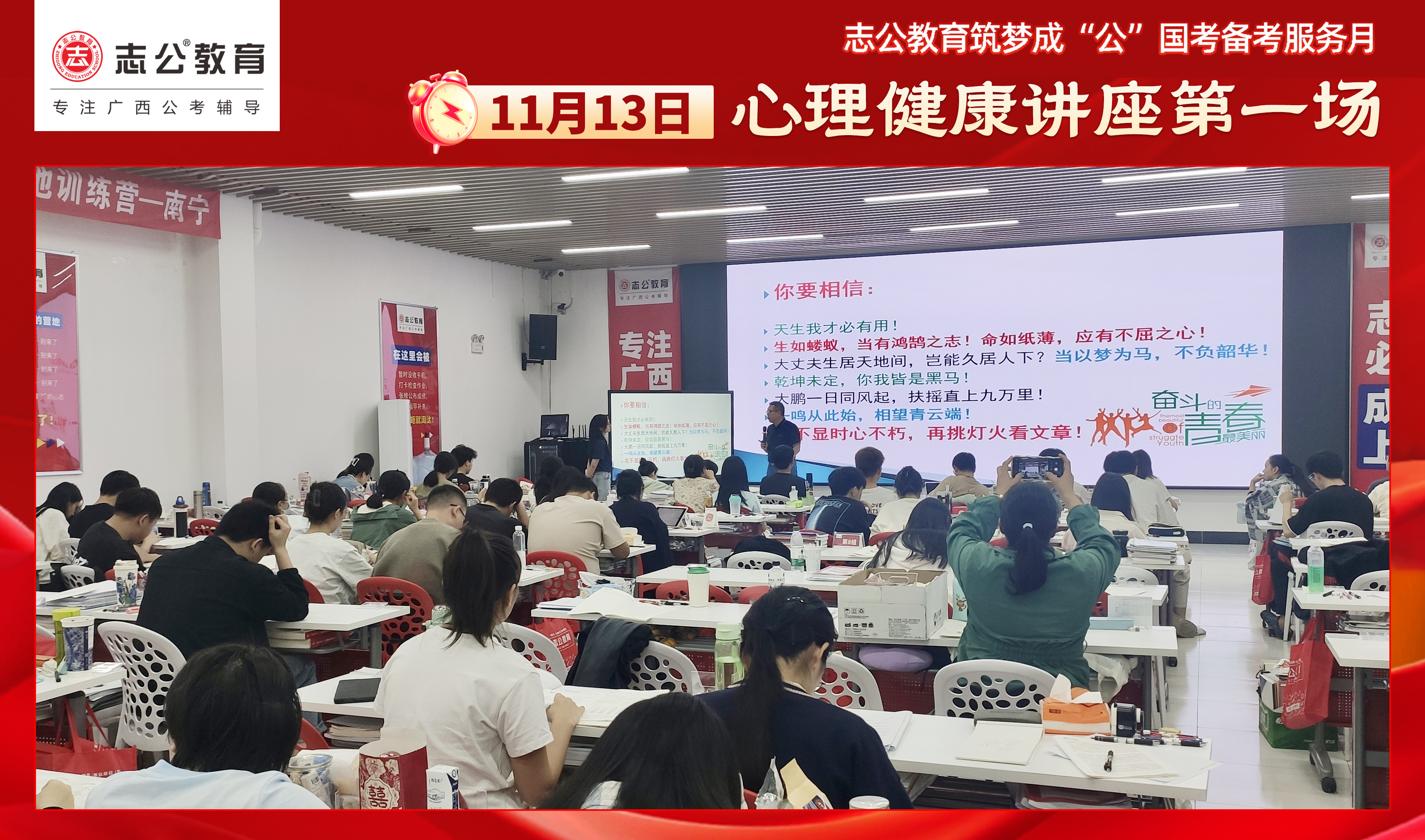 親愛的考生們,不要讓壓力成為你追夢途中的絆腳石。在志公教育基地班,你將學(xué)會如何在國考的征程中保持從容,如何在壓力下穩(wěn)步前行。且行且看且從容,讓我們一起向著國考的勝利邁進!第一場心理講座已結(jié)束,第二場心理講座將在11月17日舉行,期待大家以更從容自信的姿態(tài)應(yīng)對即將到來的公務(wù)員考試,加油!