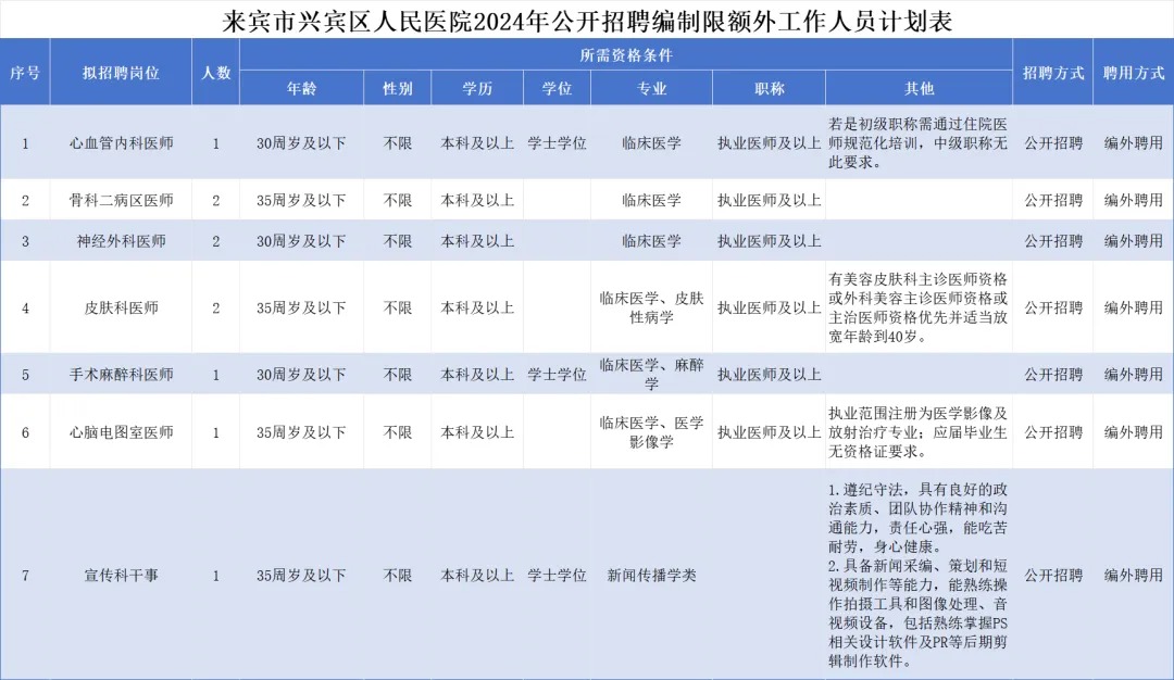 附件1:來(lái)賓市興賓區(qū)人民醫(yī)院2024年公開(kāi)招聘編制限額外工作人員計(jì)劃表.xlsx