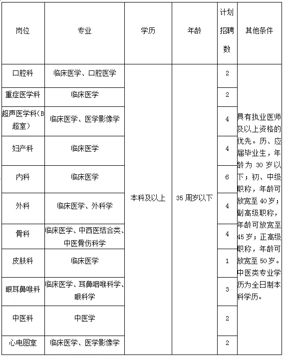 為加快醫(yī)院人才隊(duì)伍建設(shè)步伐,優(yōu)化人才隊(duì)伍建設(shè),提高人才隊(duì)伍素質(zhì),儲(chǔ)備優(yōu)秀衛(wèi)生專(zhuān)業(yè)技術(shù)人才,以滿足我院各科建設(shè)發(fā)展需要。特面向社會(huì)公開(kāi)招聘臨床醫(yī)師。