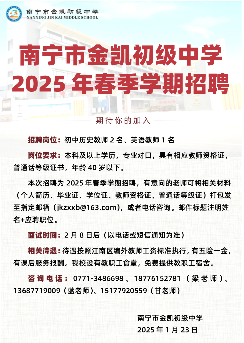 2025年南寧市金凱初級(jí)中學(xué)誠(chéng)聘歷史、英語(yǔ)教師