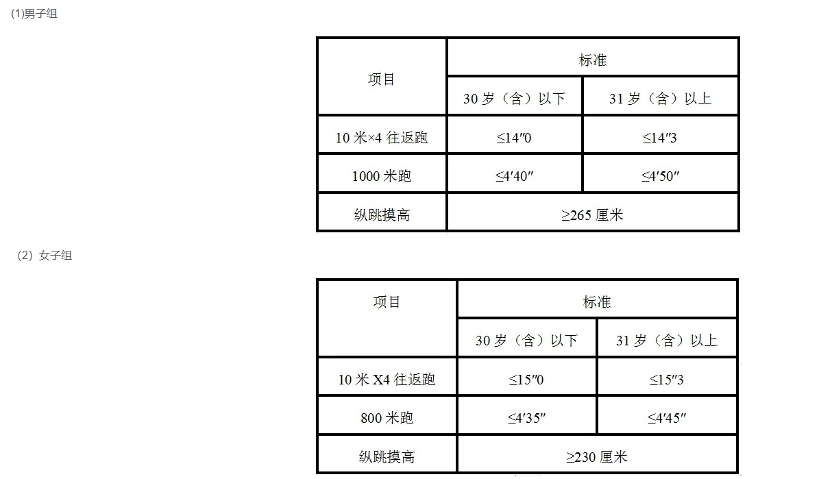 3.參照《關(guān)于印發(fā)公安機關(guān)錄用人民警察體能測評項目和標(biāo)準(zhǔn)(暫行)的通知》(人社部發(fā)〔2011〕48號)的項目及測試規(guī)則,結(jié)合《公安民警體育鍛煉達標(biāo)手冊》成績標(biāo)準(zhǔn),體能測評的項目和標(biāo)準(zhǔn)如下: