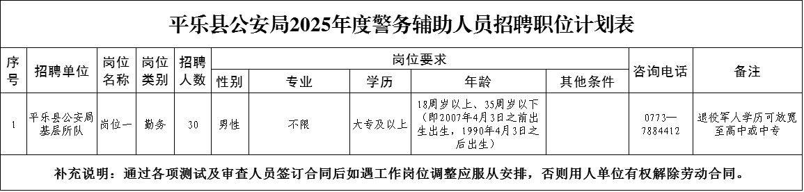 1.對確定聘用的人員,與平樂縣公安局簽訂勞動合同(合同期限為三年,試用期不超過6個月)。平樂縣公安局按照有關規(guī)定組織崗前培訓,凡在崗前培訓及試用期內(nèi)不合格者,按照《中華人民共和國勞動合同法》相關規(guī)定,解除勞動合同。對擬簽訂合同的人員,非不可抗拒原因自愿放棄的,列入警務輔助人員招聘“黑名單”,之后不再聘用。對簽訂合同的人員,統(tǒng)一由縣局安排工作;不服從安排的,經(jīng)調(diào)劑后,仍不服從安排的,將解除合同,同時列入警務輔助人員招聘“黑名單”,之后不再聘用;