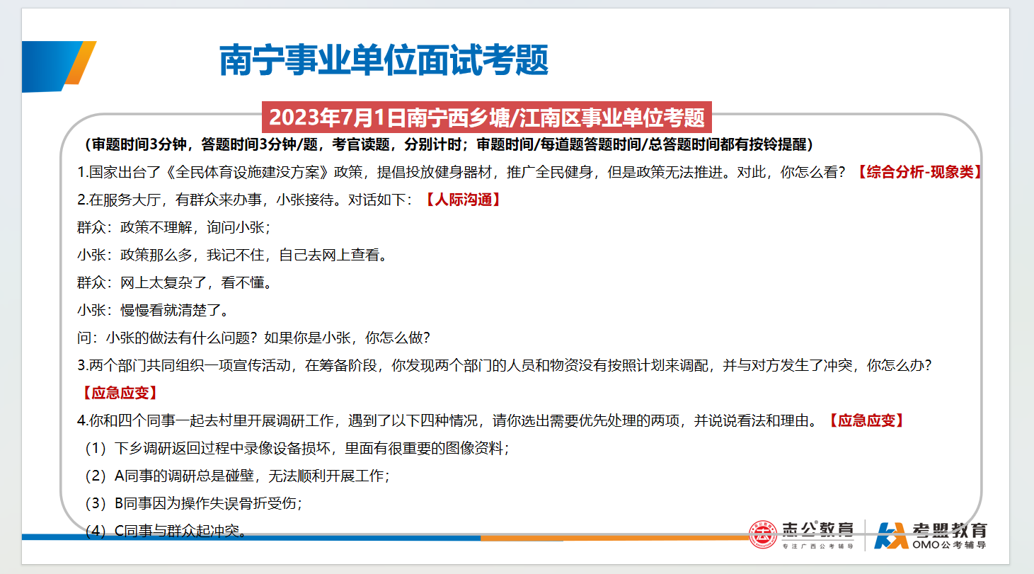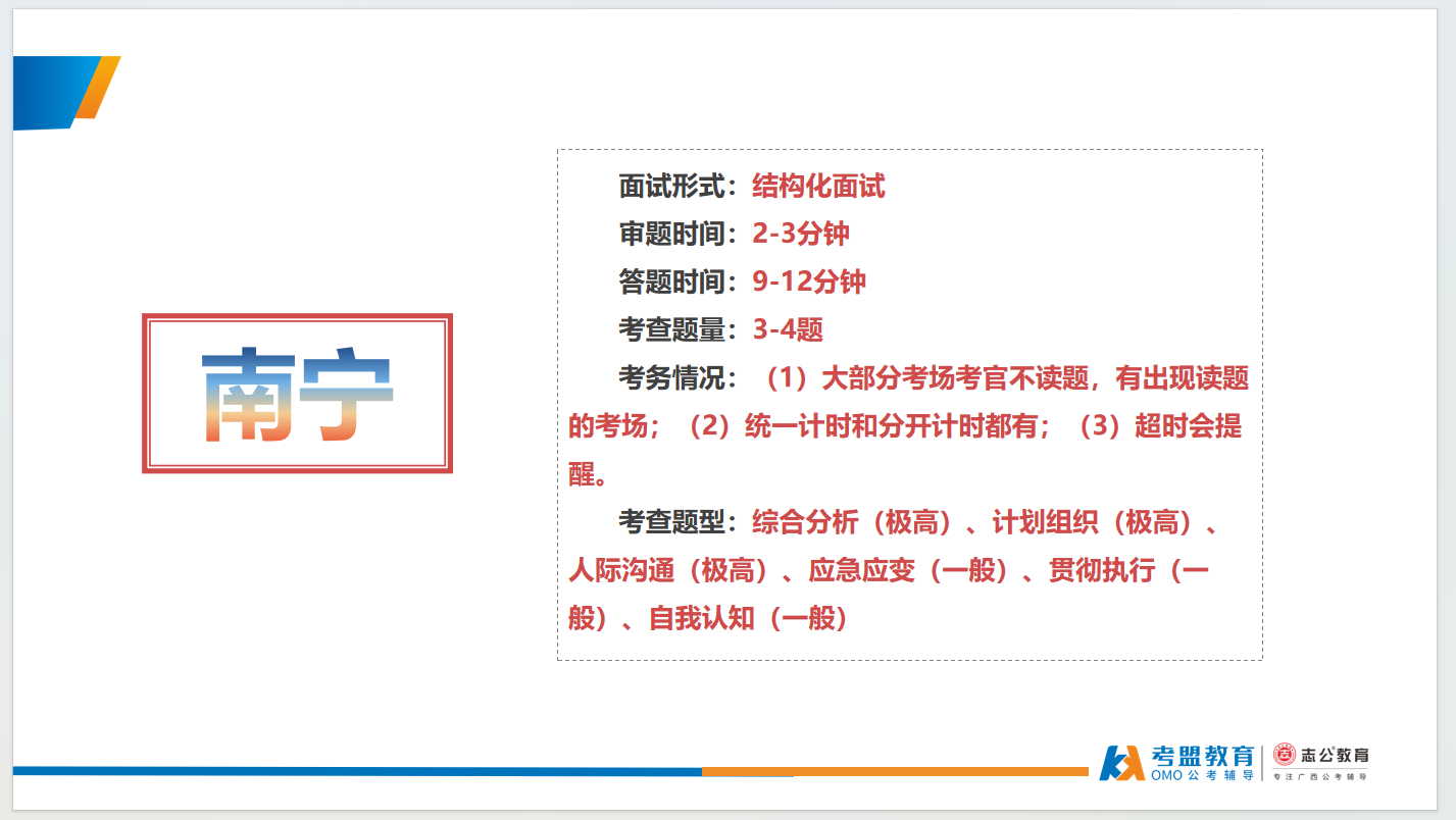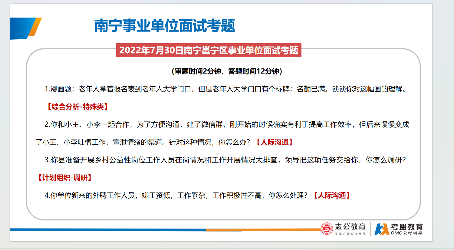 南寧事業(yè)單位面試主要采用結(jié)構(gòu)化面試形式、考查題量有3-4題,答題時(shí)間為9-12分鐘,考查題型:綜合分析(極高)、計(jì)劃組織(極高)、人際溝通(極高)、應(yīng)急應(yīng)變(一般)、貫徹執(zhí)行(一般)、自我認(rèn)知(一般):