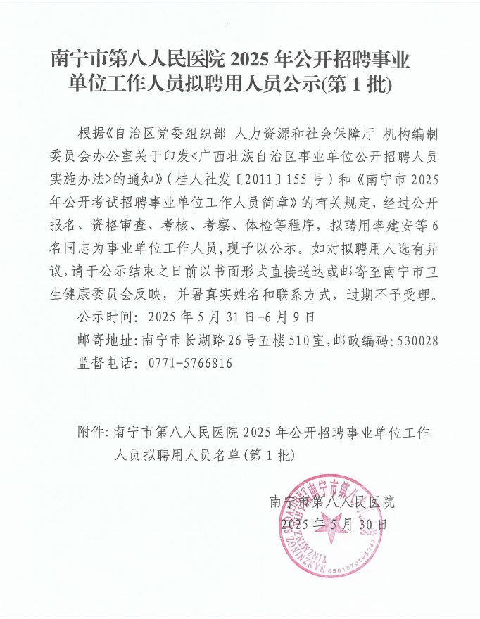 南寧市第八人民醫(yī)院2025年公開招聘事業(yè)單位工作人員擬聘用人員公示(第1批)