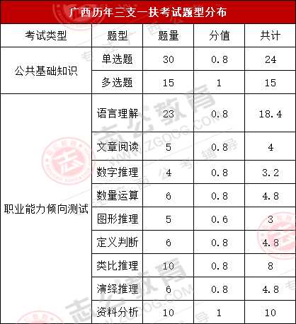 上篇我們寫(xiě)到,三支一扶的待遇,在廣西這個(gè)待遇還算不錯(cuò),政策上的支持也非常好,那么預(yù)計(jì)這個(gè)月月底出公告的三支一扶,啥時(shí)候筆試呢?2024年廣西三支一扶筆試時(shí)間是7月13日,其筆試科目為《綜合知識(shí)》一科,滿分100分。基于往年考生的回憶,綜合知識(shí)內(nèi)容主要包括公共基礎(chǔ)知識(shí)和行測(cè)職業(yè)能力測(cè)試兩個(gè)科目,而各題型的題量及分值如下圖所示: