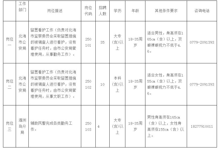 有關(guān)招聘信息,應(yīng)聘人員可登錄北海市人才網(wǎng)(www.bhrc.cn)、北海市公安局微信公眾號(hào)“北海公安”查詢(xún)。咨詢(xún)報(bào)考崗位、資格條件等信息,可在工作時(shí)間內(nèi)致電各崗位咨詢(xún)電話(huà)。