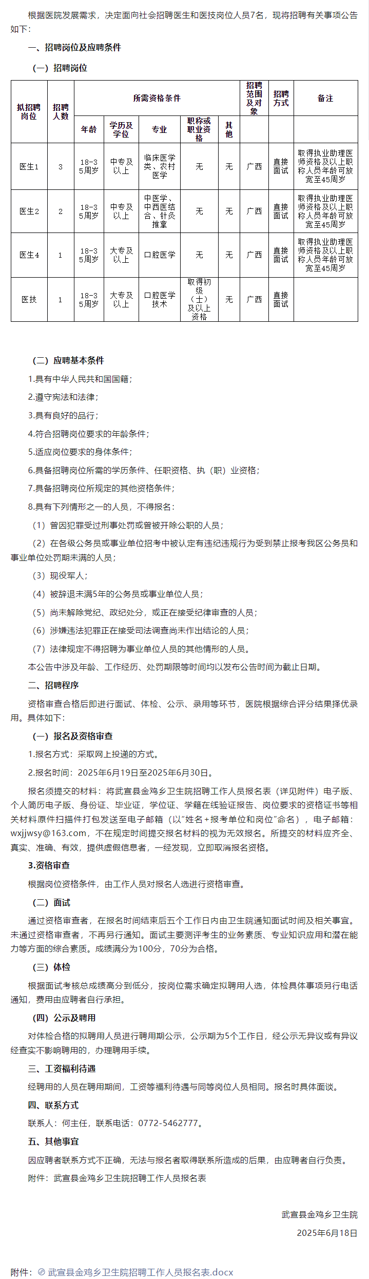 原文標(biāo)題:武宣縣金雞鄉(xiāng)衛(wèi)生院2025年公開招聘編外聘用人員公告(第二期)