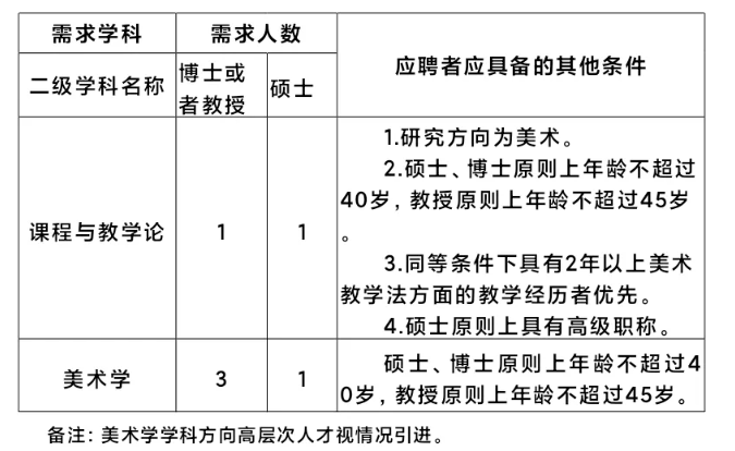 美術(shù)學院2025年計劃在美術(shù)學、課程與教學論(美術(shù))等專業(yè)方向招聘6位專任教師,其中計劃招聘博士或者教授4人,碩士2人。