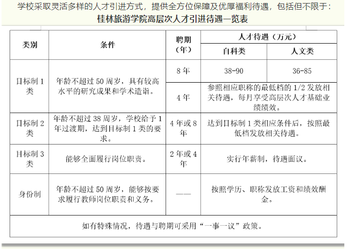 4.根據(jù)自治區(qū)政府文件要求,符合相應(yīng)條件者,學(xué)校積極配合申請廣西壯族自治區(qū)高層次人才認(rèn)定和各類人才項目,若入選可享受各類優(yōu)厚的人才待遇,詳情請登錄廣西高層次人才“一站式”服務(wù)平臺(http://www.gxrc.org/)查閱。首次來桂工作的35歲以下、具有博士學(xué)位的青年人才,可按照政策申領(lǐng)自治區(qū)青苗人才普惠性支持。如入選桂林市高層次人才,還可以享受桂林市高層次人才有關(guān)津貼、購房補(bǔ)貼和個稅獎勵等人才補(bǔ)助。詳見桂林市高層次人才一站式服務(wù)平臺(https://gcc.glrcw.com/)。