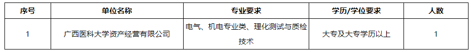 廣西醫(yī)科大學(xué)資產(chǎn)經(jīng)營(yíng)有限公司(以下簡(jiǎn)稱公司)是由廣西醫(yī)科大學(xué)于2011年8月3日獨(dú)資設(shè)立,經(jīng)營(yíng)管理廣西醫(yī)科大學(xué)經(jīng)營(yíng)性國(guó)有資產(chǎn)和對(duì)外投資的股權(quán)。公司依托學(xué)校和附屬醫(yī)院的資源優(yōu)勢(shì),圍繞醫(yī)藥、養(yǎng)老、醫(yī)學(xué)檢驗(yàn)、大健康項(xiàng)目等領(lǐng)域開展投資與合作,積極探索產(chǎn)學(xué)研協(xié)同發(fā)展。根據(jù)工作需要,現(xiàn)面向社會(huì)公開招聘工勤崗工作人員,具體招聘事宜如下: