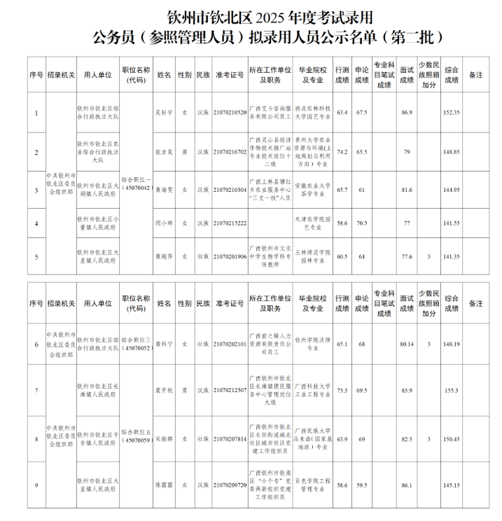 根據(jù)《廣西壯族自治區(qū)2025年度考試錄用公務(wù)員公告》等有關(guān)規(guī)定,經(jīng)過公開報(bào)名、資格審查、筆試、面試、體檢、考察等程序,擬錄用吳軒宇等9名同志為公務(wù)員(參照管理人員),現(xiàn)予以公示(附件)。公示期為5個(gè)工作日,如對擬錄用人員的錄用資格有異議,請?jiān)诠酒趦?nèi)向中共欽州市欽北區(qū)委員會組織部干部監(jiān)督股實(shí)名反映。