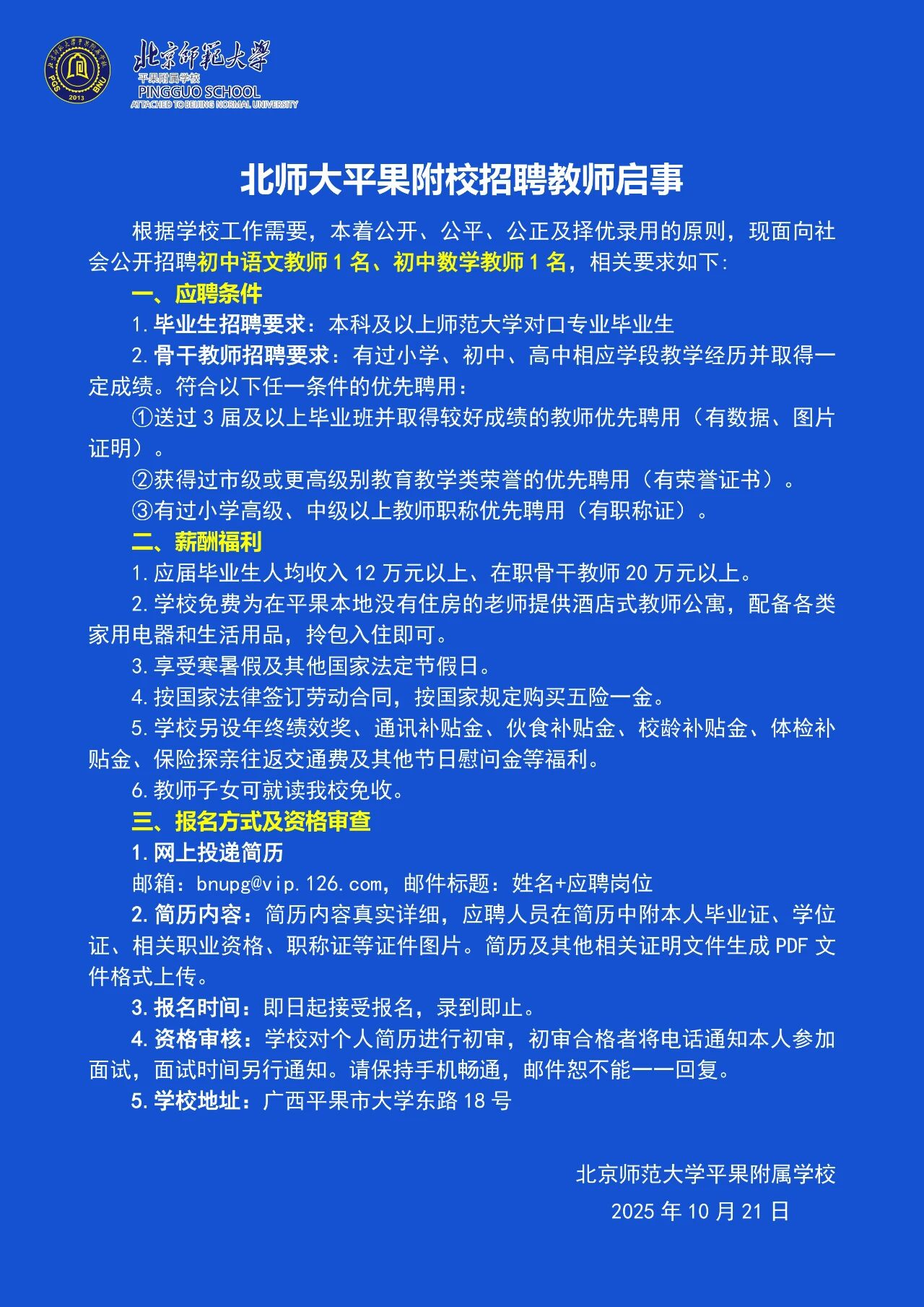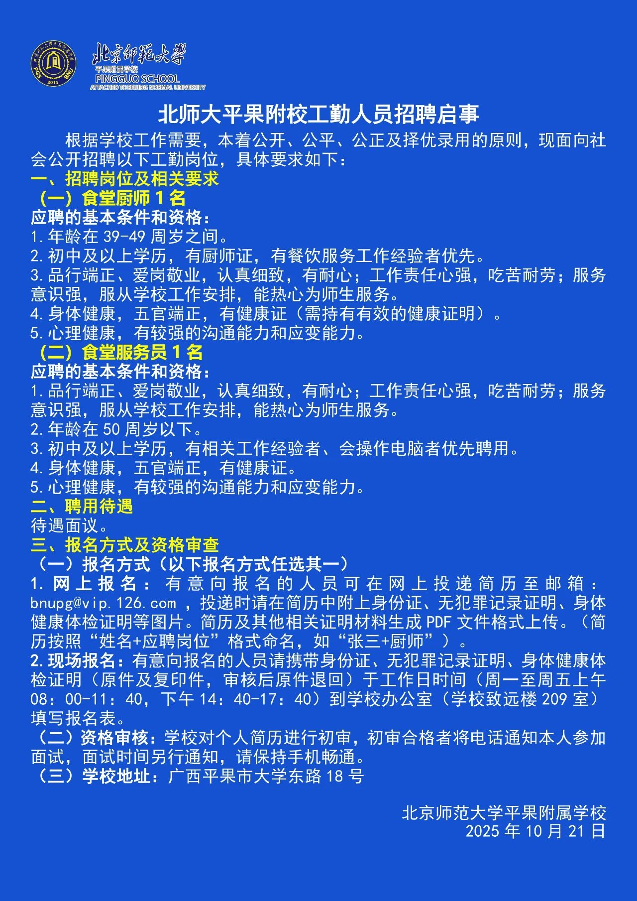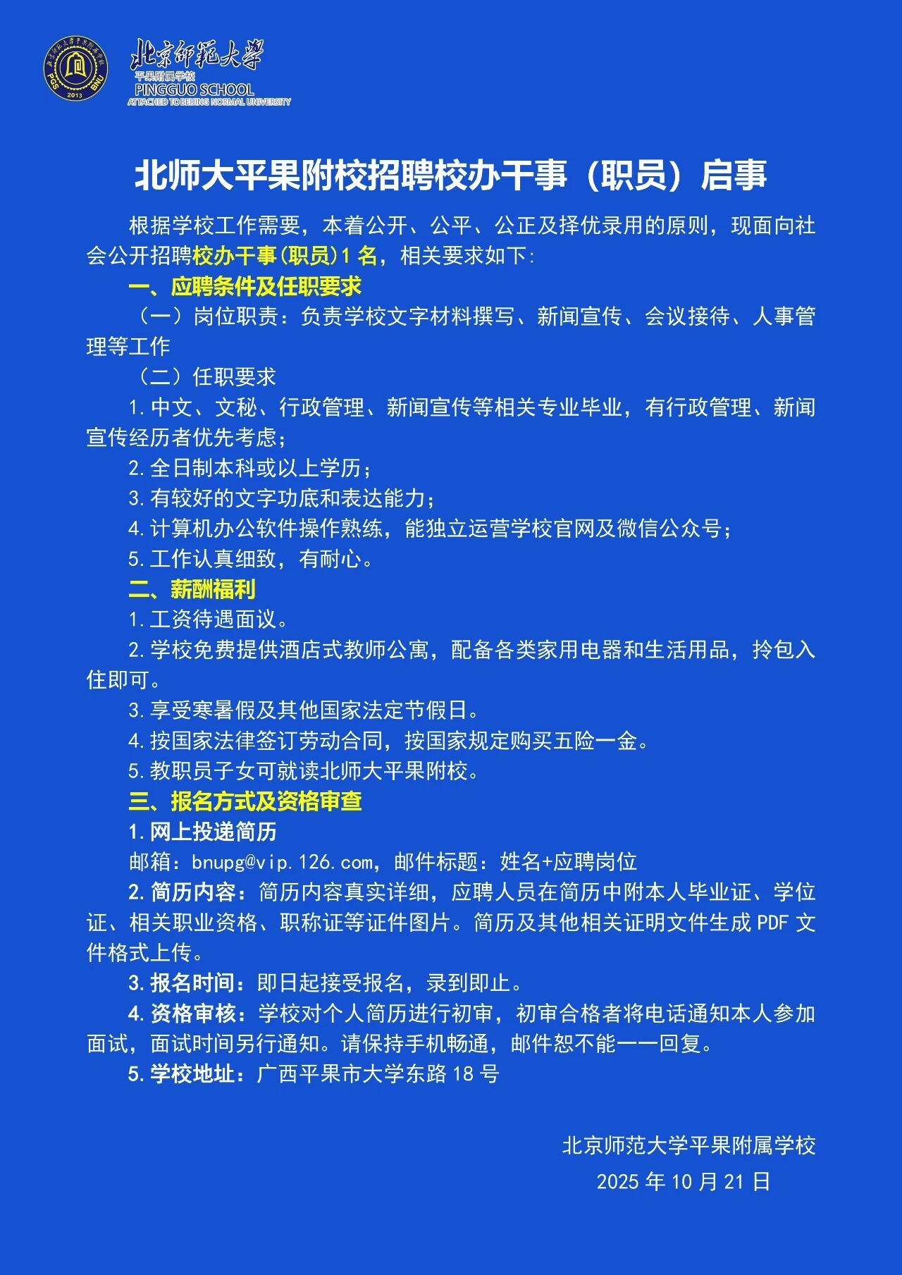 原文標(biāo)題:北師大平果附校教師、校辦干事及工勤人員招聘啟事