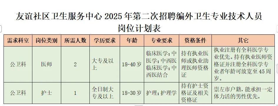 附件1 友誼社區(qū)衛(wèi)生服務(wù)中心2025年第二次招聘編外衛(wèi)生專業(yè)技術(shù)人員崗位計(jì)劃表.docx