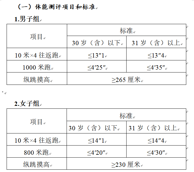 參照《關于印發(fā)<公安機關錄用人民警察體能測評項目和標準>的通知》(公政治〔2024〕60號)執(zhí)行,每個測評項目分別記錄成績。其中縱跳摸高的測評次數不超過3次,10米×4往返跑測評次數不超過2次,男子1000米跑、女子800米跑測評次數均為1次。
