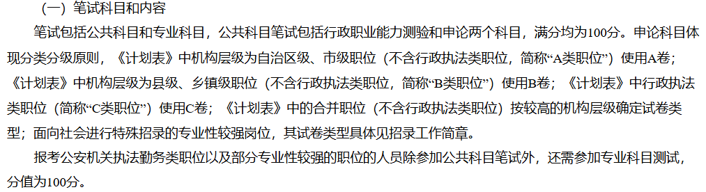 公共科目為行政職業(yè)能力測驗(yàn)(100 分)、申論(100 分)。申論分 A/B/C 卷:自治區(qū) / 市級(jí)職位(非行政執(zhí)法類)用 A 卷;縣 / 鄉(xiāng)鎮(zhèn)級(jí)職位(非行政執(zhí)法類)用 B 卷;行政執(zhí)法類職位用C卷。
