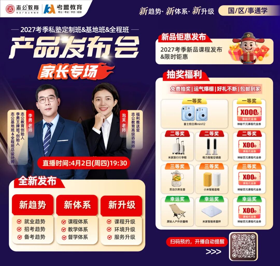 面對(duì)孩子棘手的就業(yè)與考公難題,家長(zhǎng)們往往深感無力。針對(duì)這一系列關(guān)切的痛點(diǎn),志公教育于4月2日(周四)19:30舉辦“新趨勢(shì)·新體系·新升級(jí)——2027考季公考產(chǎn)品發(fā)布會(huì)”重磅直播,從專業(yè)的角度分析解讀當(dāng)前就業(yè)、招考、備考的新趨勢(shì),為廣大學(xué)子及家長(zhǎng)送上備考的“及時(shí)雨”,滿足家長(zhǎng)和學(xué)子們對(duì)獲得更優(yōu)質(zhì)的學(xué)習(xí)環(huán)境、課程體系、督學(xué)服務(wù)、教學(xué)成果的期待。同時(shí)直播間免費(fèi)送出更多超值福利。