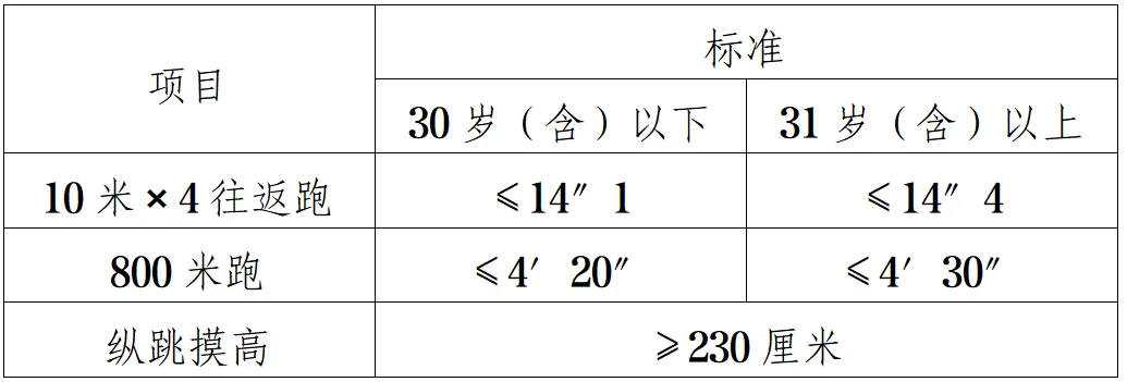 按照《關(guān)于印發(fā)〈公安機(jī)關(guān)錄用人民警察體能測評項(xiàng)目和標(biāo)準(zhǔn)〉的通知》(公政治〔2024〕60號)執(zhí)行。體能測評項(xiàng)目包括10米×4往返跑、1000米(男)/800米(女)跑、縱跳摸高等3個(gè)項(xiàng)目。其中,綜合管理類、執(zhí)法勤務(wù)類職位測查全部3個(gè)項(xiàng)目,警務(wù)技術(shù)類職位免予測查1000米(男)/800米(女)跑項(xiàng)目;對于專業(yè)人才緊缺難以形成競爭的特殊職位(緊缺職位),報(bào)考人員需在參加體能測評前,從3項(xiàng)體能測評項(xiàng)目中選擇2項(xiàng)參加測試。凡應(yīng)測項(xiàng)目中任意一項(xiàng)不達(dá)標(biāo)的,即為體能測評不合格。具體如下: