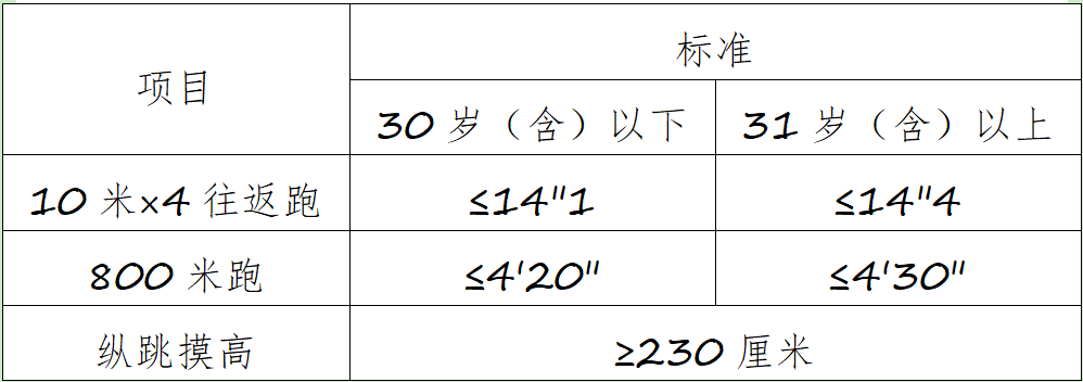 按照《公安機(jī)關(guān)錄用人民警察體能測評(píng)項(xiàng)目和標(biāo)準(zhǔn)》(公政治〔2024〕60號(hào))執(zhí)行。體能測評(píng)項(xiàng)目包括10米×4往返跑、1000米(男)/800米(女)跑和縱跳摸高3個(gè)項(xiàng)目,其中綜合管理類、執(zhí)法勤務(wù)類職位測查全部3個(gè)項(xiàng)目,警務(wù)技術(shù)類職位免予測查1000米(男)/800米(女)跑項(xiàng)目;對(duì)于專業(yè)人才緊缺難以形成競爭的特殊職位(緊缺職位),報(bào)考人員需在參加體能測評(píng)前,從3項(xiàng)體能測評(píng)項(xiàng)目中選擇2項(xiàng)參加測試。凡應(yīng)測項(xiàng)目中任意一項(xiàng)不達(dá)標(biāo)的,即為體能測評(píng)不合格。標(biāo)準(zhǔn)如下: