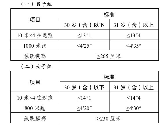 體能測(cè)評(píng)執(zhí)行中央組織部辦公廳、公安部辦公廳印發(fā)的《公安機(jī)關(guān)錄用人民警察體能測(cè)評(píng)項(xiàng)目和標(biāo)準(zhǔn)》(公政治〔2024〕60號(hào))有關(guān)規(guī)定,縱跳摸高每人最多可測(cè)3次,10米×4往返跑每人最多可測(cè)2次,男子1000米(女子800米)每人最多可測(cè)1次。體能測(cè)評(píng)的項(xiàng)目和標(biāo)準(zhǔn)如下: